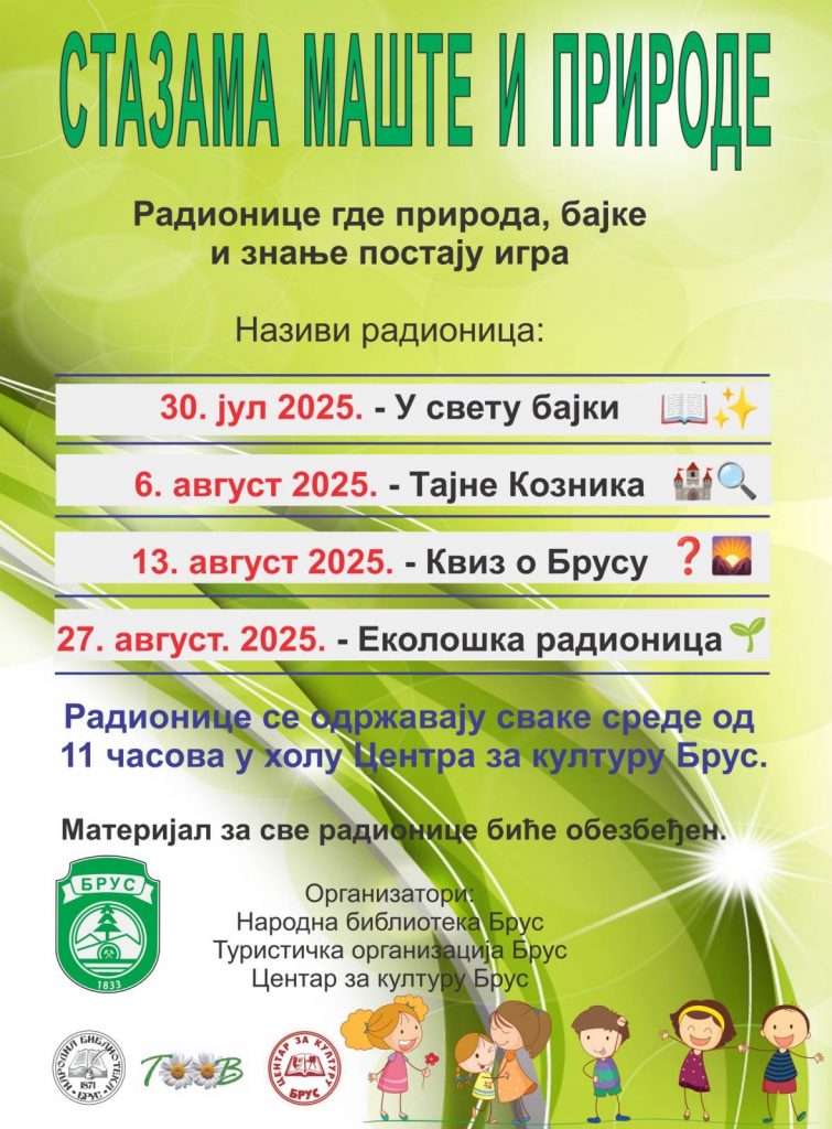 Народна библиотека Брус, Центар за културу Брус и Туристичка организација општине Брус покренули су заједничку летњу иницијативу намењену најмлађим суграђанима – креативне радионице под називом „Стазама маште и природе“.